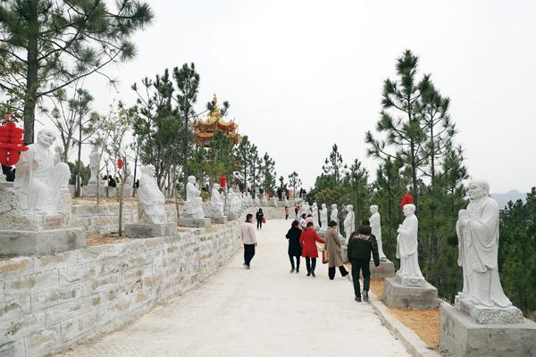 近年来,当地在“第一山”的山顶斥资修建休闲文化公园,在园内道路两旁立有造型各异的108尊石刻罗汉像,建有一座观景亭以及一座慈祥而又庄严的三面观音像,成为邻近村民健身、观光、休闲之地。