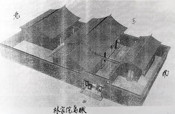 林家院是一处近1000多平方米的小建筑群,有上院、中堂和下院,还有屋前屋后的园地。除了大黑门上挂着的两盏写有大大“林”字的大灯笼和门庭顶上的一对小翘拱尚依稀能看出当年的些许庄严,和下书仓巷的郭家相比显得苍旧了许多。林家院的大门朝西,三级台阶上的门庭两旁坐落着两座40公分见方、半米多高的石墩子。在白天里,厚实的两扇大门虚掩着,门庭屋檐两旁的屋眉上各有两小幅彩画,过了大门槛有两米宽的门院,过了门院是一个5米见方的小天庭,走过小天庭的大门框就是一处大天庭。