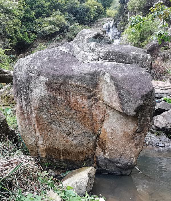近日,笔者到智泉风景区春游,在景区上游发现两方古崖刻。对两方古崖刻进行冲刷清洗后,笔者量尺寸记录文字,一方为明代莆田知县何南金题刻,最上部横刻二大字“观瀑”,字幅高24厘米,宽55厘米。“观瀑”二大字下方竖刻二行,计十字“巴峡门三析,扶桑海一杯”,字幅高69厘米,宽60厘米。“观瀑”二大字左边竖刻一行落款:“广陵何南金题”,字幅高35厘米,宽5厘米。何南金题刻书法刚劲挺拔。另一方为兴化府断案判决布告崖刻:“因山水溉田/,本府具断案令,□□主大老爷/王批案源头分水。”字幅高110厘米,宽125厘米。