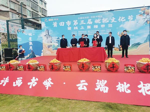 本报讯 助农销售,守望相助。以“直播+助农+电商”模式,进行“正宗原产地”枇杷带货,唱响区域生态品牌,实现共享共赢目标。 4月19日,由市商务局、市农业农村局、仙游县人民政府主办,仙游县商务局、县农业农村局、书峰乡人民政府承办的市第三届枇杷文化节暨线上直播带货活动在书峰乡枇杷公园举行。