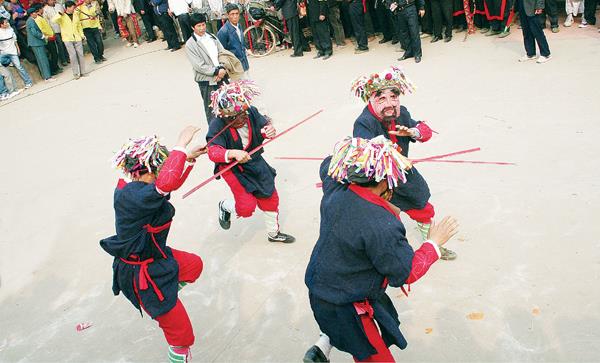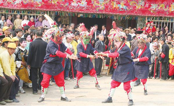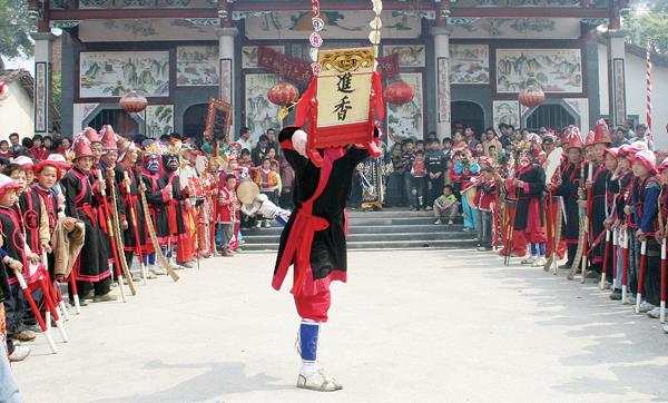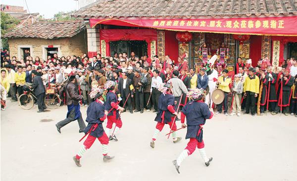 2.麟山宫皂隶舞在长期的民俗活动中,成为当地出游、游灯等各项活动中不可缺少的舞蹈表演,并定形成了一整套规制严格的舞蹈技艺和表演形式。