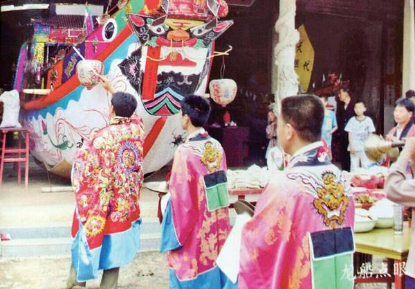 点眼。下午五时,七位法师在顶埕供桌前开始做道场。他们在鼓乐齐鸣声中,念经祷告,穿梭跑场。在神秘而热烈的气氛中,只见一位法师抱着一只大公鸡,领班法师右手执宝剑,左手端瓷碟,在鸡冠上取血,然后二位法师用毛笔蘸着鸡血,庄重而虔诚地分别给龙舟、凤船及神像点眼。龙舟又高又长,点眼时手臂不够长,无法触及。这时聪明的法师就想出一个巧办法,把毛笔绑在一支两米长的竹枝上,增加了长度,顺利点眼。点眼的顺序是从船首到船尾,从船外到船内。令人称奇的是船首高处那尊苏爷,点眼后头会活动,栩栩如生。船上庙宇中的五帝,点眼后好像有了灵性,正在指挥十将和水手驾御龙舟和凤船,驶向大海,驱瘟去邪,保佑信众平安。