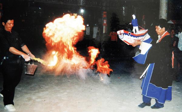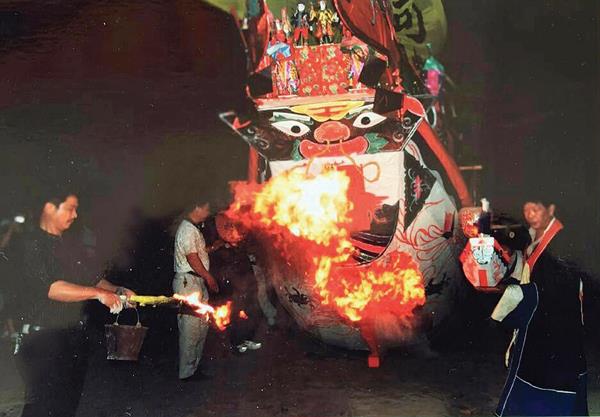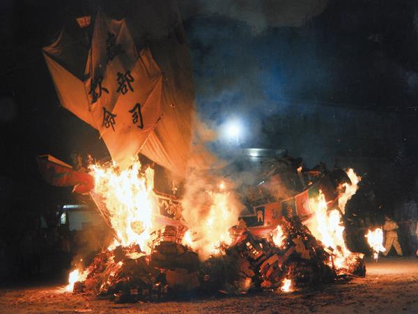 化船。晚上八时左右,整个送王船习俗达到了高潮。前殿中央的执事分列两旁,神情肃穆,并高声吆喝着,大锣开道,长号轰鸣,铳枪齐放,焰花腾空。在惊天动地声中,八名壮汉迅速地将龙舟抬到大埕的贡银堆上,点火焚化。顿时,熊熊的烈焰冲天而起,场面极其壮观,方圆二三十里内都能看得见。正所谓“借问瘟君欲何往,纸船明烛照天烧”!场上的人们也齐声欢呼,一片痴狂!紧接着20多只凤船也被一一送入火堆焚化。至此,长达四个多小时的闽台送王船习俗宣告结束。