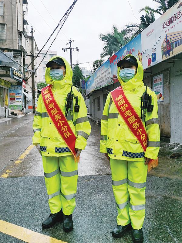 6月7日上午,莆田哲理中学考点,城厢护考服务小分队队员在雨中执勤