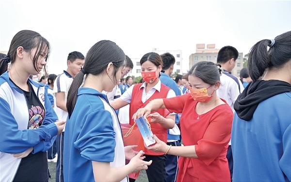 下午2时许,在妈祖中学大操场,祖庙妈祖义工与妈祖中学家委会成员将手工粽子和妈祖平安糕送到学子手中,取“高中”(糕粽)之意,希望学子们在最后的冲刺阶段,积极备考,蟾宫折桂,金榜题名。
