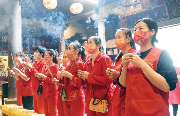 天后宫内,家长们祈愿妈祖赐福