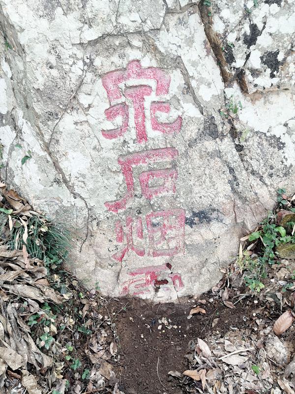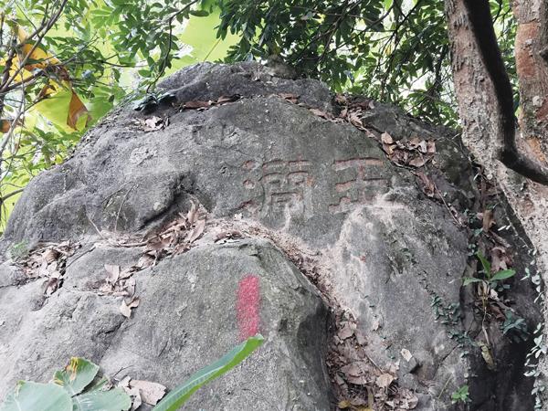 说起“玉涧北岩”,先提及大象峰,大象峰发脉于龟山,与石室山连。山形如大象,得名。而鸡足峰自大象发脉而来,岐而为三,如鸡足,以形似名,又名“北岩”。鸡足峰前,唐时有“玉涧北岩”。在今北磨社区下斜村入山二三里处,巨石上还刻有隶书“玉涧”两字(如图4)。