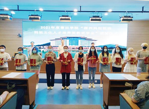 6月8日,2021年度湄洲妈祖祖庙妈祖文化人才培养奖教奖学金颁奖大会在莆田学院紫霄校区举行。莆田学院副校长李文芳,湄洲妈祖祖庙董事会副董事长吴国春,莆田学院文化与传播学院副院长帅志强及全体获奖师生参加,妈祖文化研究院副院长曾伟主持仪式。