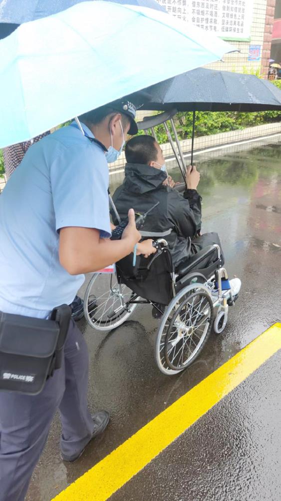 6月8日上午,仙游县私立一中一名学生腿部受伤行走不便,且雨势渐大地板湿滑,考点执勤人员林阳和陈立勇得知该情况后,一路帮助家长推着轮椅护送该学生顺利返程。“考场周围有民警值守,考试环境被保护得很好,作为家长我很放心很安心。”受助学生家长感激地说道。(时报记者 林锦堂 通讯员 魏静 陈婧)
