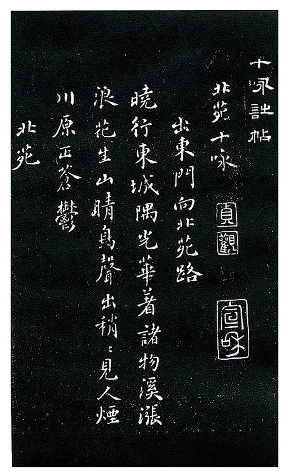 【按】据明代宋珏《古香斋宝藏蔡帖》卷二中《十咏诗帖》(拓本)载,《北苑十咏》“出东门向北苑路”:“晓行东城隅,光华著诸物。溪涨浪花生,山晴鸟声出。稍稍见人烟,川原正苍郁。”