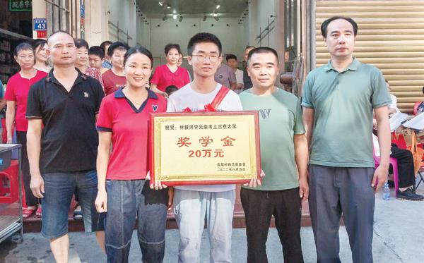 本报讯 8月5日,仙游县盖尾镇盖尾村洋溢着一派喜庆气氛——该村支书兼村委会主任史建林代表村振兴基金会,在由村民自发组成的仪仗队、车鼓队、舞蹈队陪伴下,热热闹闹前往考取了北京大学的林毅同学家送上20万元奖学金。