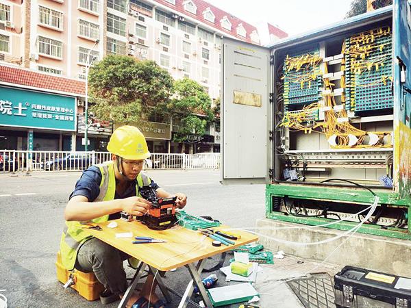 移动智慧家庭工程师正在现场熔接光纤。
