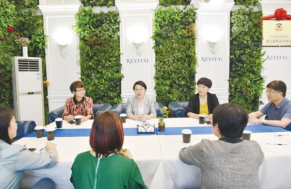 ▲市政协主席沈萌芽、副主席赵爱红在华腾新天地“委员履职活动驿站”与委员们共同学习研讨。
