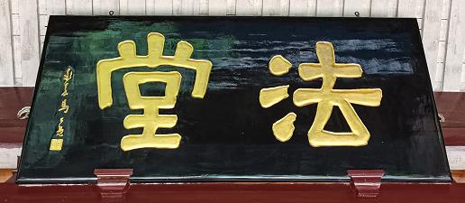南山广化寺大雄宝殿后座是法堂、藏经阁,此楼分上下两层:一楼为法堂,二楼为藏经阁。民国十二年(1923),在法堂上加建藏经阁,三年(即民国十五年,1926)落成。一楼法堂正中门楣悬挂“法堂”横匾。隶书。署款:“永嘉马公愚”。钤印一方。
