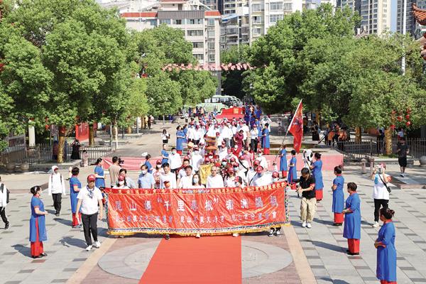 当天上午9时30分,懿明楼前广场上,红灯高挂,彩旗飘扬,在“两岸一家亲”的浓厚氛围中,全国台企联及昆山等地台商协会负责人一行近百人,不远千里来到妈祖故乡“寻根”,受到妈祖故乡人民的热烈欢迎。在举行妈祖驻驾安座仪式和“三献礼”妈祖非遗展示后,嘉宾们兴致勃勃地参观了懿明楼内的妈祖陶瓷艺术展品等,两岸同胞面对面、手牵手,同叙妈祖缘,共话妈祖情。