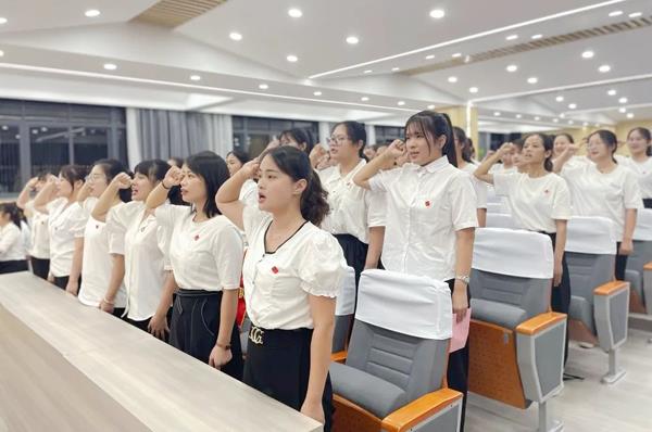 铿锵有力的誓言在会场久久回荡,这是每一位教育人对教育初心的铭记,也是对教育使命的担当,全体新教师将以对学生和家长高度负责的精神,立足本职工作,关爱学生成长,做好学生的引路人。陈怡馨作为新教师代表发言,她非常期待进入教师行业,希望能在职业生涯中帮助更多学生技能成才,将个人成长和国家需求结合起来,实现精彩人生。她表示,将牢记立德树人使命、精进专业知识素养、树立终身学习的理念,赓续前行,奋楫争先,以积极心态和强烈责任心迎接以后的每一天。