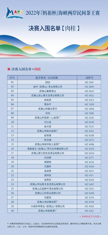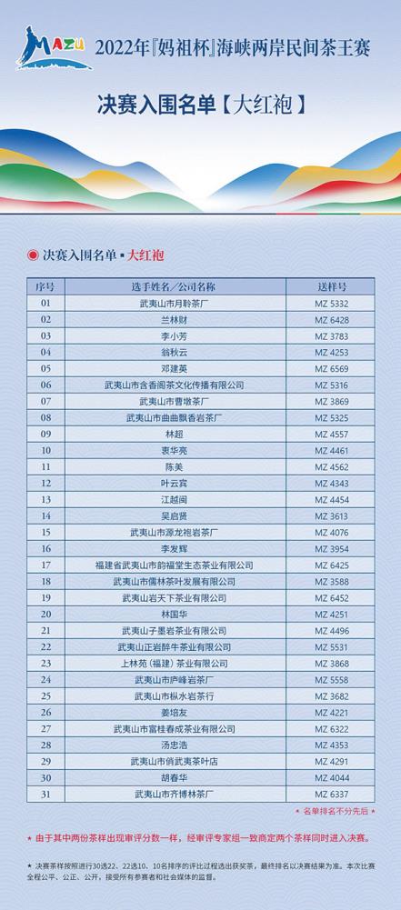 本报讯 记者获悉,经过六天的激烈角逐,由莆田市政协牵头的2022年“妈祖杯”海峡两岸民间茶王赛武夷岩茶决赛入围名单出炉。