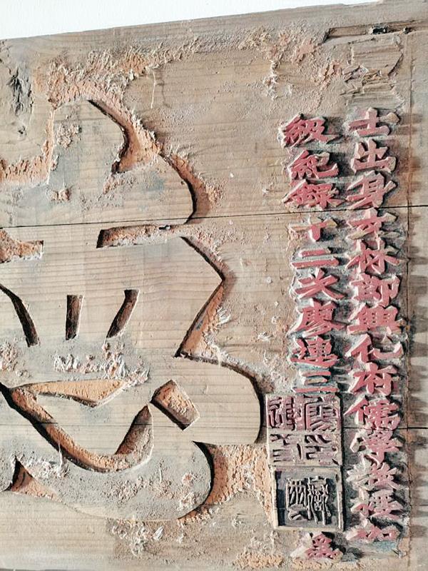 笔者与村民郭桂方先生交流,他为笔者提供一条信息,说郭氏古时有从郭庄分支到今涵西街道涵西社区港头自然村。其见笔者喜欢文史,就带到崇祀堂右帐,参观一块清乾隆三十七年(1772)的古匾,这是他于数年前到本村一户家里看到此匾,动员捐献后,由他送到祠堂收藏。笔者对此匾拍照并量尺寸,古匾长212厘米,宽55厘米。杉木材质。古匾正中刻榜书“德绍敬姜”四大字,上款:“赐进士出身、文林郎、兴化府儒学教授加□级纪录十二次廖连三为”,下款:“宋旌表郭孝子之门、寿母张孺人立,乾隆壬辰年九秋吉旦”。