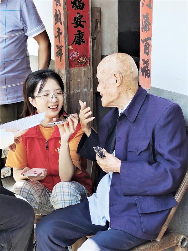 ▲黄洋村老游击队员许玉棣与时光小分队成员开心交谈。 龙佳欣/摄