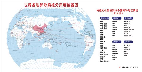 湄洲岛是妈祖文化的发源地。妈祖信仰历千年而不衰,妈祖宫庙遍及世界各地。最新的全球妈祖宫庙普查结果显示,湄洲妈祖已分灵全球49个国家和地区,分灵版图新增毛里塔尼亚。