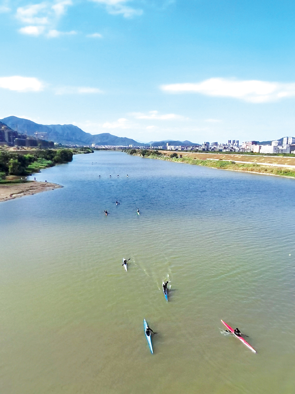 10月26日上午,记者在城厢区樟塘村樟林大桥上看到,几十艘皮划艇犹如离弦之箭破浪疾行,粼粼溪水间瞬间上演着速度与激情。移开视线看四周,生态护坡绿意盎然,木兰溪水清丽迷人,近处山峰葱郁秀美,好一派生态宜居胜境。