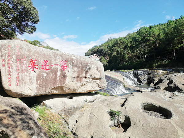 郑纪与子主忠,不仅对武夷山留有诗文,而且对九鲤湖存有诗话。明代书法家林有恒在九鲤湖题写的“第一蓬莱”横式楷书左侧,镌刻郑纪题诗:野趣谢千钟,老景寻神仙作会;湖光涵万象,梦魂与天地同流。”落款:“东园”,字迹雄浑,遒劲有力,与林有恒楷书镌刻天作之合。