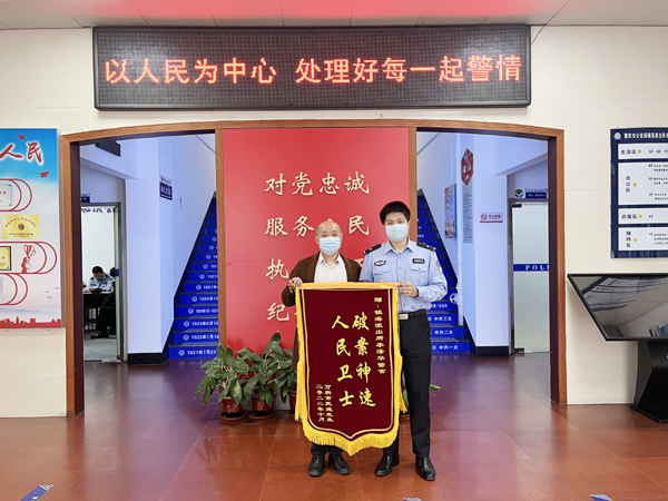 本报讯 11月3日上午,群众施先生将一面写有“破案神速,人民卫士”的锦旗,送至镇海派出所民警手中,以表达对民警快速破案的感激之情。据悉,10月29日早上8时许,施先生求助称其摩托车停在莆阳人家门口被盗,希望民警帮忙找寻。民警在详细了解情况后,调取相关地点的视频监控,通过视频倒查、轨迹追踪,于10月29日中午11时追回报案人被盗摩托车。施先生领到被盗的摩托车后,感激之情,溢于言表,特意来到派出所向民警赠送锦旗,感谢道:“我是真没想到摩托车还能找回来,而且这么快,实在太感谢了!”(林芬 陈娟)