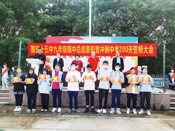 本报讯 三年磨剑,六月试锋。为振奋精神,鼓舞士气,考出成绩,创造辉煌,近日,莆田第十五中学九年级全体师生、家长齐聚操场举行 “九年级其中总结表彰暨冲刺中考200天誓师大会”。