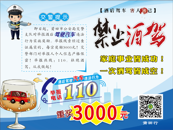 今年年初,莆田交警部门推出有奖举报酒醉驾制度,对举报饮酒后驾驶汽车违法行为的市民,每起奖励3000元。这一制度推行以来,全市共接报汽车类酒醉驾线索1235条,查实酒醉驾192条,发放奖金57.6万元,举报线索、查获数、发放奖金均居全省首位。同时,交警部门成立汽车酒醉驾查缉队,重点突出夜间举报的查缉工作,随时待命,快速反应,精准打击。