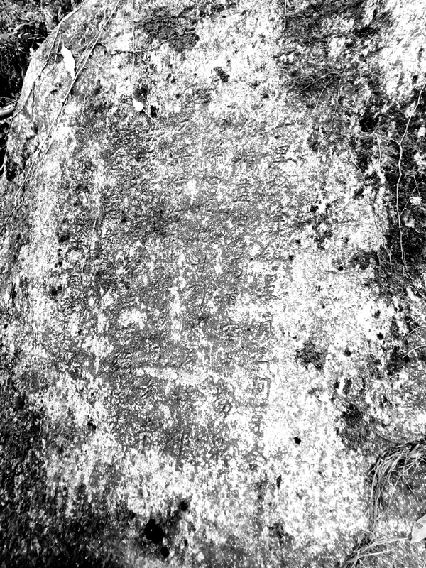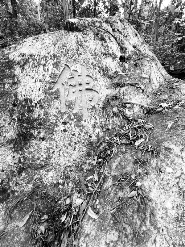 张琴的书法精美,文采斐然,他的摩崖石刻为秀美的自然风景增添了深厚的人文内涵。我们沿着宝泉寺后门山间小路探寻他的另一处摩崖石刻。山道狭窄、原始,石阶上的青苔记录着年深月久,落叶,青草,藤蔓,篦子草,点缀了山道的原始况味。采风团二十余人行在山道上,热闹了整座山林。我们很快寻到了另一摩崖石刻,这是一块大岩石,中间红字“佛”(图3)远远可见,左侧刻有张琴的诗(图4),近看字迹尚清晰:“十里松峰锁翠岚,三间茅舍结精蓝。山如马首空中勒,泉似禅心咽后甘。到此尘埃都不染,何妨耶佛与同参。半生虚负山民号,未共弥陀坐一庵。己丑(1949)冬日/天马山民张琴题。”