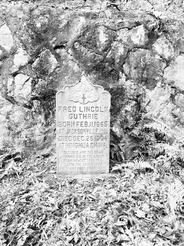 “别墅”附近长眠着一个不平凡的外国传教士,汉名叫高德理。他是莆田一座西学堂的校长,为救一个在操场上体育运动时不慎摔倒昏迷不醒的学生,背着学生狂奔几里外的医院,学生获救,他却心脏衰竭而去,年仅39岁。他的墓碑上刻着英文墓志铭(图7),其中一句是:“他们虽然停歇了自己艰苦的劳作,但其光辉业绩将伴随着他们的美名永存。”为纪念德绩双馨、舍己救人的高德理校长,学校后来改称兴郡哲理中西学堂,又称莆田哲理中学,即今莆田二中前身。他合力创建的哲理钟楼至今保存完好。