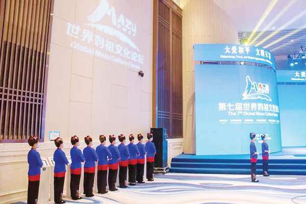 学生志愿者参加世界妈祖文化论坛服务。