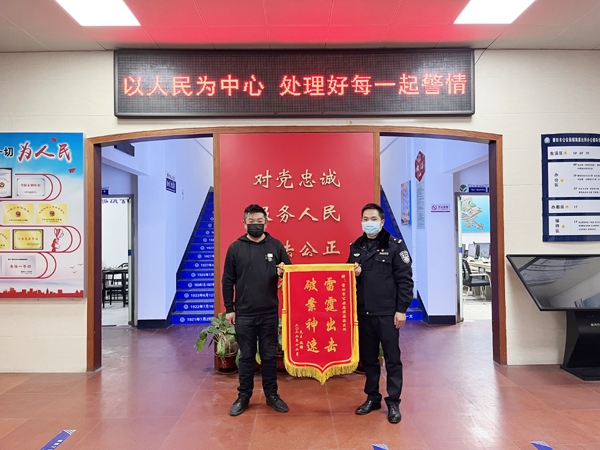 本报讯 1月2日下午,林先生手持一面写有“雷霆出击 破案神速”的锦旗来到镇海派出所,向及时帮自己挽回损失的民警表示感谢。