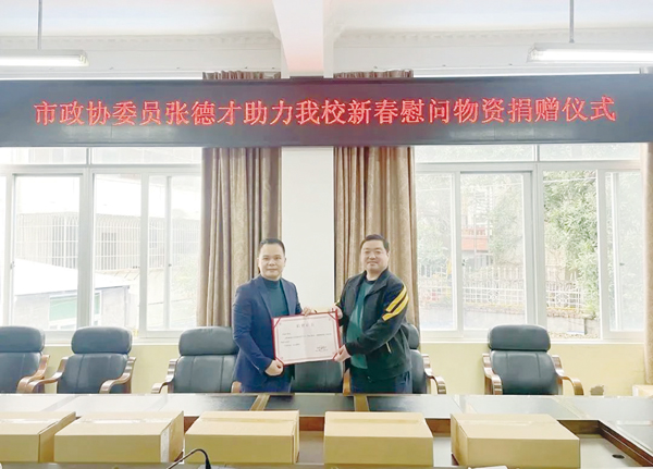 本报讯 1月12日上午,市政协委员、民建莆田市社会服务委副主任、市直总支部第三支部主委、福建省钟风投资发展有限公司董事长张德才到文献中学走访慰问,并向学校捐赠了新春慰问物资。