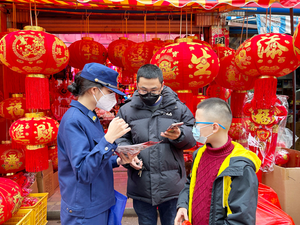 “大姐,提前给您拜个早年,消防安全知识请多了解一些,大家一起平平安安过大年!”在涵江商业城“年味市集”上,支队消防宣传人员用“唠家常、话消防”的方式向摊主和前来购买年货的群众发放消防安全宣传资料,现场讲解安全用电、用气和“乡村土灶台”火灾防范等相关消防安全常识,普及初期火灾的扑救方法与正确的火场逃生自救技巧,并重点提醒过年时燃放烟花炮竹的注意事项,确保人民群众过上一个平安、祥和、热闹的新春佳节。