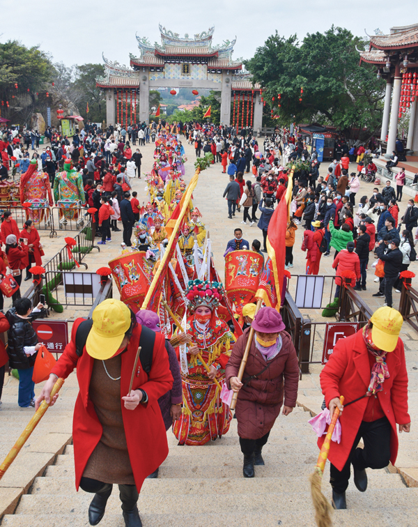 上午9时许,新县昭天宫董事长林兆展率200多位本宫妈祖敬仰者抵达湄洲岛,进香团成员身着喜庆庙服,或敲锣、或打鼓、或执旗……恭请分灵妈祖一路踩街至祖庙,喜庆热闹的进香氛围和极具地方特色的民俗阵头吸引大量香客、游客驻足拍摄。