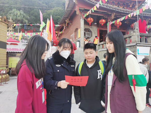 本报讯 1月29日,农历正月初八,是一年一度市民前往石室岩寺进香朝拜,祈福新年平安如意的传统节日。城厢公安分局组织执勤民警积极做好安保工作,同时向前来祈福的群众开展禁毒宣传。民警们通过分发禁毒宣传单、讲解各类毒品危害、普及禁毒法律法规等方式,引导全民树立健康美好的生活习惯,自觉远离毒品,有效提升群众识毒、拒毒、防毒的能力,共同营造和谐美好的新春氛围。(李宇逸)