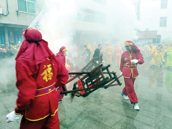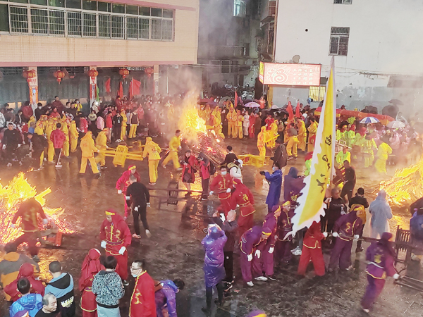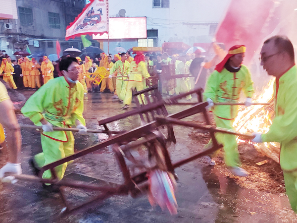 莆田元宵民俗文化内容丰富,有游灯、摆棕轿、爬刀梯、打铁花、打铁球、皂隶舞、红盘出游、点烛山等形态各异的民俗表演,可谓是“十里不同风,一村一习俗”。农历正月十五,记者慕名前往城厢区南门社区观看摆棕轿表演。