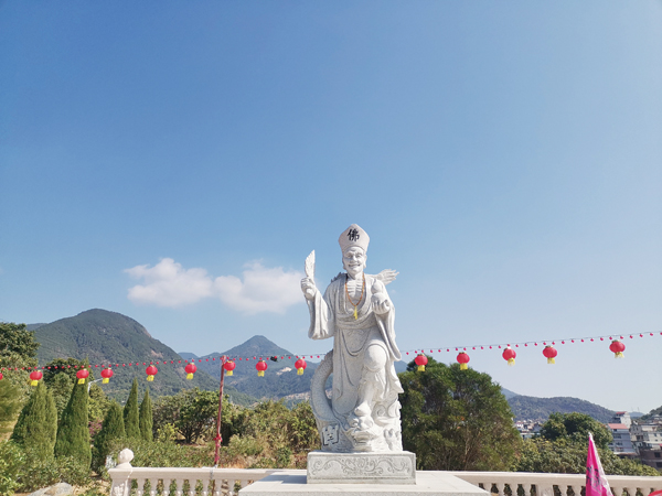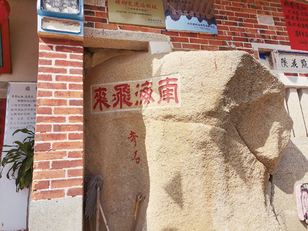 往回走,经埔柳村。埔柳村有个兰亭寺,始建于明朝,光听这寺名就感到气质不凡,我不禁想到了《兰亭序》,顿时觉得这是一座有文化味的寺。寺门左墙内嵌着一块巨石,上刻“南海飞来”四个字。这巨石不是别处搬来,砌砖墙时,把这块有特色的石头融合了进去,倒也是匠心独到。