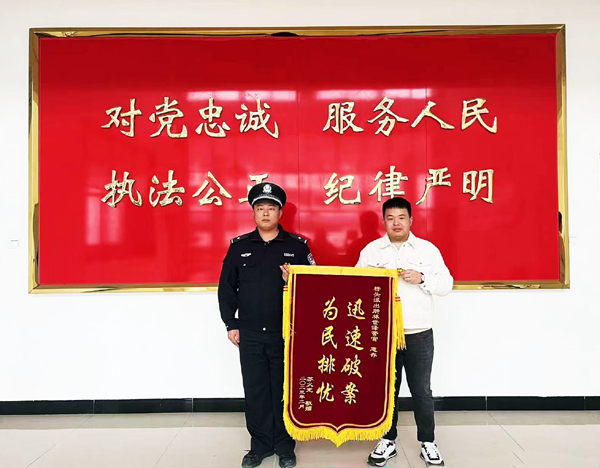 2月15日,群众苏某将一面写有“迅速破案,为民排忧”的锦旗亲自递到榜头派出所民警林世泽手中,对民警对其挽回其被盗经济损失二十余万(价值不止)表示感谢。