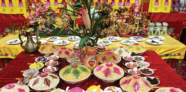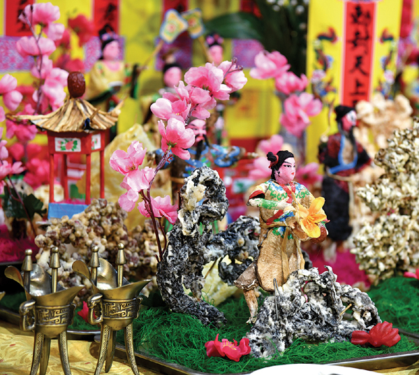 此外,文峰宫非遗项目《妈祖供品》亦吸引了众多市民的目光,栩栩如生的妈祖供品让人叹为观止。妈祖供品是民间传统的敬神献礼食品装饰艺术,俗名“妈祖筵桌”,通常在妈祖神诞和升天纪念日,以及传统节日摆列供奉。其配套和摆列均有相对固定的格式,供桌上必备香、花、果盒、馔盒、寿桃、面饭、五果、六斋、茶、酒,以及自由创作的食品装饰造型艺术作品,其中的妈祖故事人物造型、水族朝圣、海鲜景等,别具特色。