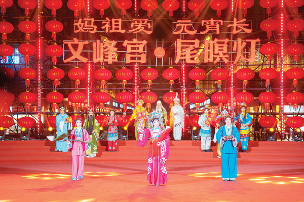 五福献瑞文峰宫,烛山祈福“尾暝灯”。华灯初上,文献路中段人山人海,人们引“火母”点烛山、点烛船,诚心祈愿新年红火安康。烛山蜡烛不能全点完,要留下二寸许“烛脚”,待到二月初一,各家各户再来请回他们的“烛脚”,带回家中继续点燃,寓意瑞兆临门、全年平安。当晚7时许,古谯楼前,莆仙戏剧院倾情演绎文峰宫非遗项目《大五福》,依次表演“天官赐福”“五子登科”“铁笔春秋”“毓麟瑞凤”“万宝朝宗”,福星、禄星、寿星、禧星、财星致贺赐福。