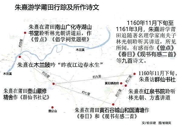 笔者考察发现,朱熹曾过莆田十二次。其中,1160年11月下旬至1161年春夏间,系朱熹第七次专程来莆田,追随著名理学家“南夫子”林光朝、理学名贤方次云访师求学,时间近半年,有感而作九首诗文,诗文名称如下: