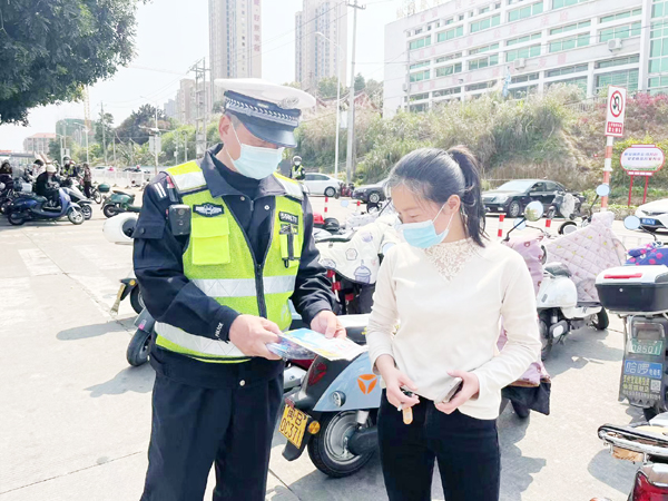 活动中,民警积极开展学校周边道路整治,对驾驶电摩车不按规定佩戴安全头盔、随意穿行、机动车乱停乱放等违法行为进行劝导。民警还通过发放宣传单,面对面宣讲的形式,宣传骑乘电摩车需佩戴安全头盔、汽车驾乘人使用安全带的重要性。同时,教育引导学生不要乘坐三轮车、超员车等车辆,日常出行要走人行道或靠路边行走、过马路要注意来往车辆。最后呼吁广大学生及家长,要自觉摒弃交通陋习,遵守交通法规,安全文明出行。