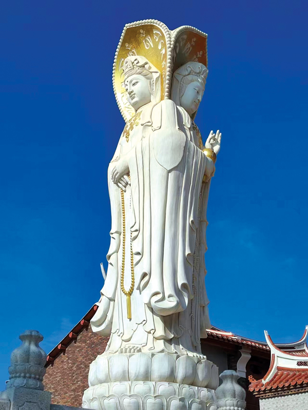 广场左侧,塑起一尊汉白玉三面观音大型雕像,连同基台高约10米,观音面对启航路,面容端庄,头像的鎏金“背光”在阳光照耀下金彩浮动,金辉闪闪。