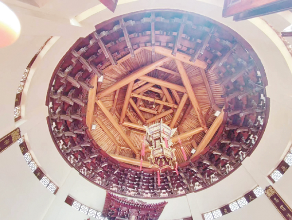 天坛形状的“靖恭妈祖殿”庄严落成。殿中供奉雕刻精美的妈祖神像,香烟缭绕,气氛神圣。殿顶的仿宋七踩斗拱全部采用民族传统榫卯结构。殿外墙环壁镶嵌全球首套青花瓷妈祖故事图。