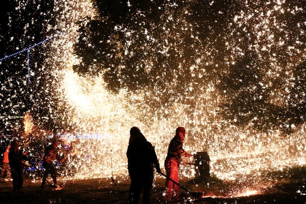 当天,师傅们早早就来到现场,起火开炉,把生铁、废铁、石灰石、焦炭放进大火炉内熔化成铁水。当夜幕降临时,表演者头戴安全头盔,行至树下,用竹片舀起铁水向树上击打,从而迸发绚丽夺目的光芒。随着打铁花表演者的一次次击打,现场响起一阵阵欢呼声和喝彩声。