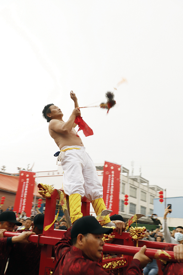 在巡安队伍中,打铁球表演无疑是本次活动的重头戏。巡游途中,只见“僮身”坐在刀轿上,用铁球不断击打后背,直至鲜血淋淋。据介绍,“坐刀轿打铁球”的元宵习俗至今已有400多年历史,已被列入“市级非物质文化保护遗产”,当地村民用这种独特勇武的方式纪念抗倭战争中的无畏英雄气概。