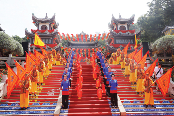当天上午,“升幡挂灯”“擂鼓迎宾”拉开本次“天下妈祖回娘家”启动仪式的帷幕。上午10时整,随着一声锣响,号手、升幡手、挂灯手依次就位,护幡手将两面绣有“天上圣母”的幡旗缓缓送入现场。来自越南、智利等国的妈祖文化机构,以及福建、广东、海南、台湾等地的谒祖进香团,齐聚湄洲,共襄盛会。在妈祖敬仰者、游客的注视下,幡旗和十八盏红灯笼在祖庙的圣旨门广场上徐徐升起,在微风中摇曳。