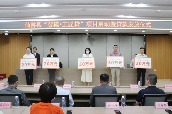 4月21日,吴寿攀等10名劳模、工匠代表,在仙游县总工会、仙游农商银行、仙游县劳模协会举办的“劳模工匠贷”项目启动暨贷款发放仪式上,现场共获得380万元的授信贷款,标志着这款为全县劳模工匠量身定制的专属信贷产品“劳模工匠贷”正式落地,以优质高效的金融服务致敬“劳模工匠精神”,献礼“五一”国际劳动节。